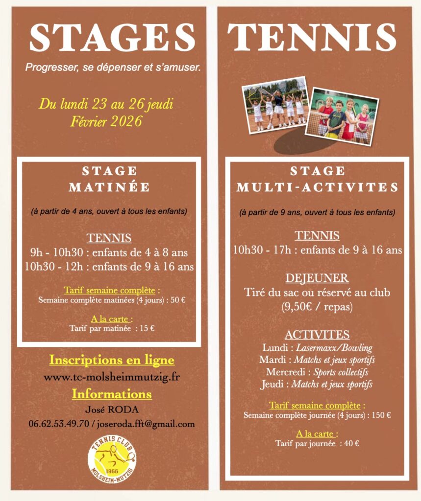 Le TC Molsheim Mutzig est un club situé idéalement entre Bruche et vignoble, dans un cadre exceptionnel. C’est un club qui privilégie la convivialité mêlée au loisir et à la compétition. Le TCMM c’est plus de 480 membres, une école de tennis de 260 enfants, des équipes jeunes et adultes, et des infrastructures totalement de qualités.