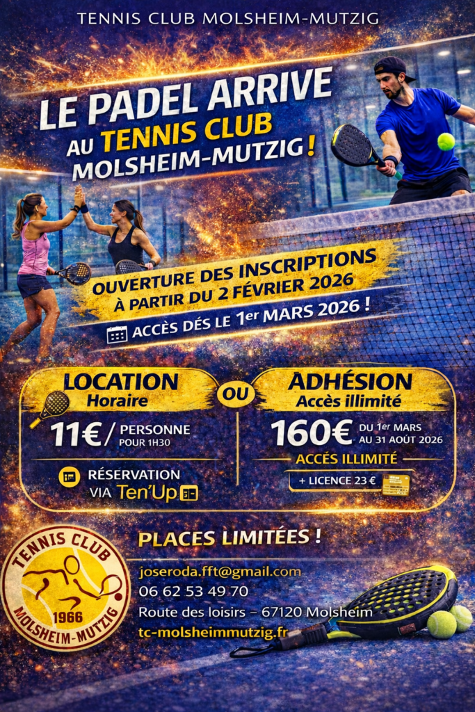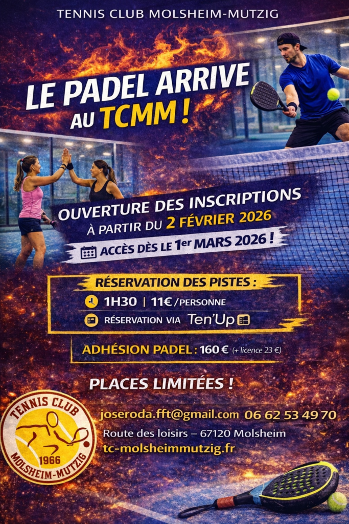 Le Tennis Club Molsheim-Mutzig (TCMM) est heureux de vous annoncer l’ouverture de ses pistes de padel, accessibles à compter du 1er mars 2026.